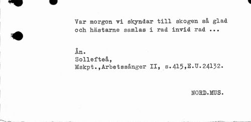 //// Yar morgon vi skyndar till skogen så glad ^^ och hästarne samlas i rad invid rad //// Ån» //// Sollefteå, //// Mskpt.,Arbetssånger II, s.415*2.U.24132. //// HORD. MS. //// \ ¦ ——• -v - - - _ _ ^Vi___ ////