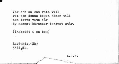 //// Tar och en som veta vill //// vem som denna "boken hörer till //// han detta veta får //// ty namnet härunder tecknat står. //// (inskrift i en bok) //// Ravlunda,(Sk) 3588, //// L.U.F. //// Jr //// .. -. ,.« ,, w.»...,, ,. ^tftiT ___«.i»._i . _i—--- _ ___ ___^ ////