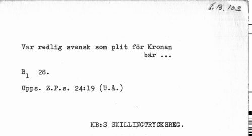 //// /O , fÖJi 1 //// ¦ //// I //// i //// I- //// Var redlig svensk som plit för Kronan //// bar ... //// B 28. //// TJpps. Z.P.s. 24*19 (U.å.) ! //// \ //// i //// - //// KBsS SKILLINGT1YCKSREG. | ////