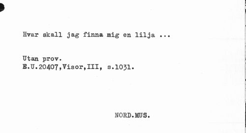 //// I ! //// Hvar skall jag finna mig en lilja ... //// t //// I //// l //// Utan prov. f //// E.U.20407,Visor,III, s.1031* //// NORD•MUS. //// 1 ////