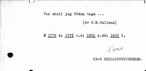 //// v—' v //// Var skall jag födan taga . //// (Av C.M.Bellman) //// B 1111 d? 1776 c,d; 1801 y,ddj 1825 1, //// m //// jW //// KB s S SKILLIIGTRYCKSREG. ////