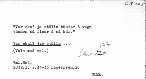 //// "Tar ska1 ja ställa hästar å vagn vännen så finer å så kär." //// Tar skall jag: ställa ?.. (Tals med mel.) //// Tml.Hed, //// 2832:1, s.43-46.Lagergren,E. ! //// ULMA. I //// i ////