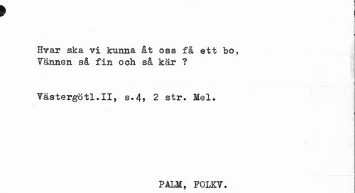 //// f //// Hvar ska vi kunna åt oss få ett bo, Vännen så fin och så kär ? //// Västergötl.II, s.4* 2 str. Mel. //// PALM, FOLKV. ////
