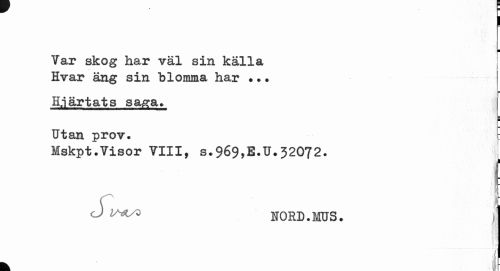 //// I ¦ //// Var skog har väl sin källa Hvar äng sin blomma har •?• //// h,iartats sa&a» //// ¦ //// Utan prov. t //// Mskpt.Visor VIII, s.969,E.U.32072. //// J NORD.MUS. j //// 1'-, yr i ////