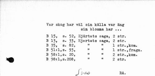 //// Var skog har väl sin källa var äng //// sin blomma har .•• //// B 15, s. 52, Hjärtats saga, 2 str. B 13, s. 33* Hjertats saga, 2 str. B 35, s. 82, M 11 1 str.,kom. //// B 51:1,s. 93, " M 1 str.,fragm. //// B 58:1,s. 20, 11 M 2 str.,kom. B 98:l,s.208, « " 2 str. //// J l^O RA. ////