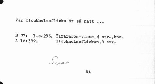 //// w //// Var Stockholmsflicka är så nätt ... //// B 27: l,s.283, Tararabom-visan,4 str.,kom. A 16:J82, Stockholmsflickan,8 str. //// r //// RA. ////
