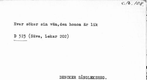 //// > r r v - r ^ <jr //// * //// ¦ ¦ //// Hvar söker sin vän,den honom är lik D 323 (Säve, Lekar 202) //// | //// DENCKER SÅNGLEKSREG. ! ////