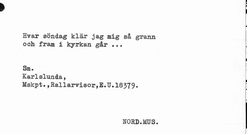 //// > I //// F //// Hvar söndag klär jag mig så grann o ch fram i kyrkan går ... //// ¦ //// Sm. //// Karlslunda, . //// Mskpt.,Rallarvisor,E.U.18379. //// HORD. MUS. ////