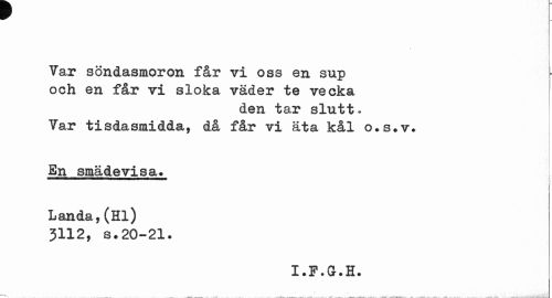 //// Var söndasmoron får vi oss en sup och en får vi sloka väder te vecka //// den tar slutt * Var tisdasmidda, då får vi äta kål o.s.v. //// En smädevisa» //// Landa, (Hl) 3112, s.20-21. //// x • F. a • H. ////