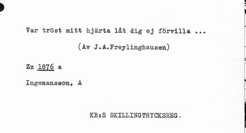 //// f i //// Tar tröst mitt hjärta låt dig ej förvilla ... //// (Av J.A.Freylinghausen) //// Zz 1876 a //// Ingemansson, A ' //// KB:S SKILLIHGTRYCKSREG. j //// i //// l ////