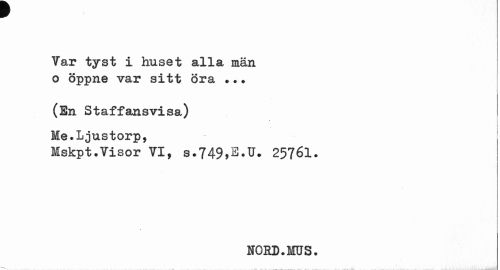 //// Tar tyst i huset et jL «L 8b man o öppne var sitt öra .. . //// (En Staffansvisa) Me.Ljustorp, //// Mskpt. Tis or TI, s.?49^.U. 25761. //// NOED.MUS. ////