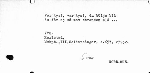 //// N. r 'y //// Tar tyst, var tyst, du bölja blå du får ej så mot stranden slå •.. //// Trm. //// Karlstad, //// Mskpt. ,HI,Soldatsånger, s.657, 27232. ^^ HORD.MUS. ////