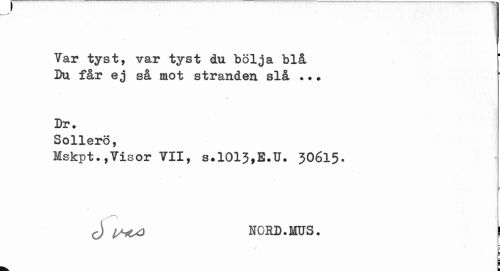 //// Var tyst, var tyst du bölja blå | //// Du får //// ej så mot stranden slå •.. f //// % //// Dr. //// Sollerö, //// Mskpt.,Tisor Til, s.l013,E.U. 30615. //// J i/^ö HORD.MUS. ! //// t». i ////