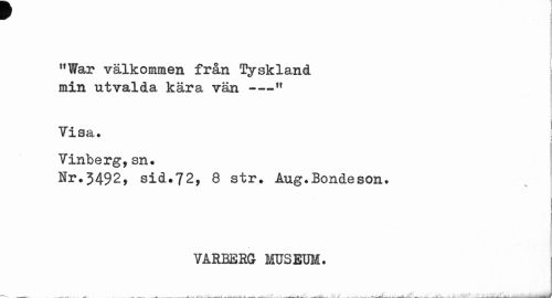 //// "War välkommen från Tyskland min utvalda kära vän---11 //// Ti sa. //// Vinberg,sn. //// Nr.3492, sid.72, 8 str. Aug.Bondeson. //// TÅREERG MUSEUM. //// . ^ . i ' „ o . - ... " ^ ////
