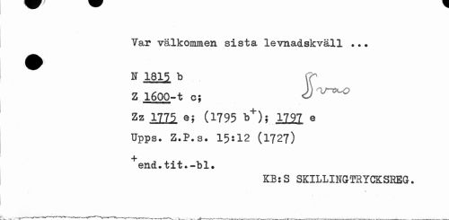 //// Ya,r välkommen sista levnadskväll //// H 1815 b fr //// rnmmmmmmmmm //// Z 1600-t c; < //// Zz un ej (1795 1221 e //// Upps. Z.P.s. 15:12 (1727) + //// end.tit.-bl. //// KB:S SKILLINGTRYCKSREG. //// \ //// »»WV —. ___v___- - . ä. . ...__ . ////