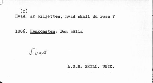 //// (r) //// Hvaå är biljetten, hvad skall du resa ? //// ¦ //// 1886, Hemkomsten» Den sälla //// L.tr.B. SKILL. MIK. //// i ¦ //// ¦ //// i ¦ ////
