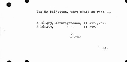 //// Var är biljetten, vart skall du resa ... A 16:429> Järnvägsresan, 11 str.,kom. //// A 16:439» - H - 11 str. //// v) lAx v> //// RA. //// ^ A åk ////