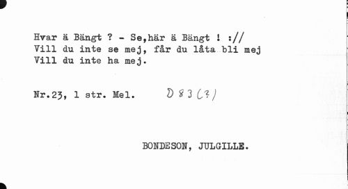//// I //// Hvar ä Bängt ? - Se,här ä Bängt i s// Vill du inte se mej, får du bli mej //// Vill du inte ha mej. //// Nr.23, 1 str. Mel. d $ 3 ) //// 1 //// BONDESON, JULGILLE. //// k ////