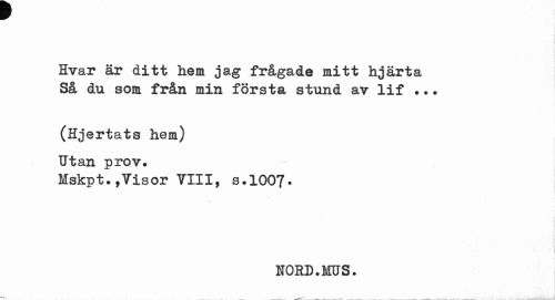//// ¥ //// Hvar är ditt hem jag frågade mitt hjärta Så du som från min första stund av lif . .. //// (Hjertats hem) Utan prov. //// Mskpt.fYisor VIII, s.1007. //// I //// HORD.MUS. //// ^r ^ . - , , ¦ ,-J J ////