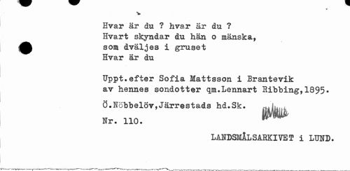 //// v //// Hvar är du ? hvar är du ? Hvart skyndar du hän o mänska, ^^ som dväljes i gruset //// Hvar är du //// Uppt.efter Sofia Mattsson i Brantevik av hennes sondotter qm.Lennart Rlbbing,1895» //// Ö.Nobbelov,Järrestads hd.Sk. ^ //// Nr. 110. //// LANDSMÅLSARKIVET i LUND. ////