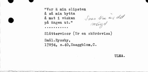 //// 11 Var ä min slipsten å så min bytta v. //// g^ å mat i väskan Stw> ^^ ^ //// w på ängen ut.» ^W //// Slåttervisor (Ur en skördevisa) Smål. Ryssby, //// 17894, s.40,Haeggblom,C. //// ULMA. ////