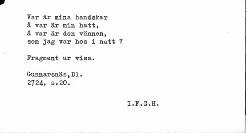 //// Var är mina handskar å var är min hatt, å var är den vännen, som jag var hos i natt ? //// Fragment ur visa. //// Gunnarsnäs,Dl. 2724, s.20. //// I.F.G.H. ////
