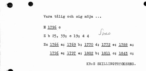 //// Vara tålig och sig nöja //// ... //// b må. c //// j * i ~ i ' //// Z b 25, 39; C 19} d 4 //// .. .. —' / //// Zz 1766 a; 1769 b; 1770 d; 1772 e; 1788 a; 1796 a; 1797 e; 1802 b; 1811 c? 1845 05 //// KB:S SKILLIHGTRYCKSREG. ////