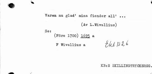 //// m //// Yaren nu glad1 mina fiender all1 ... //// (Av L.Wivallius) //// Se: //// (Före 1700) 1695 a F Wivallius a //// KB:S SKILLINGTRYCKSREG. //// / / ////