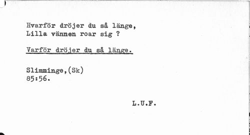 //// r //// / //// Hvarför dröjer du så länge, Lilla vännen roar sig ? //// Varför dröjer du så länge. Slimminge,(Sk) //// 85:56. //// L.U.F. ////