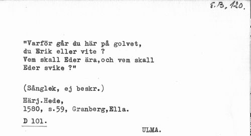 //// i //// "Varför går du här på golvet, du Erik eller vite ? Vem skall Eder ära,och vem skall Eder svike ?H //// (Sånglek, ej beskr.) Härj.Hede, //// 1580, s.59> Granberg,Ella. D 101. //// ULMA. ////