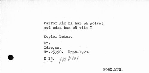 //// Varför går ni här på golvet med edra ben så vite ? //// - . r ... //// Kopior Lekar. Dr. //// Idre,sn. //// Hr.25390. Uppt.1928. //// # D 15. jfrld/O/ //// NORD. MUS. ////