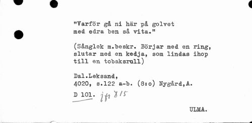 //// "Tarför gå ni här på golvet //// • med edra ben så vita*" //// (Sånglek m.be skr* Börjar med en ring, slutar med en kedja, som lindas ihop till en tobaksrull) //// Dal»Leksand, //// 4020, s.122 a-b. (8:0) Nygård,A. //// D 101 • jp )f /f //// ULMA. ////