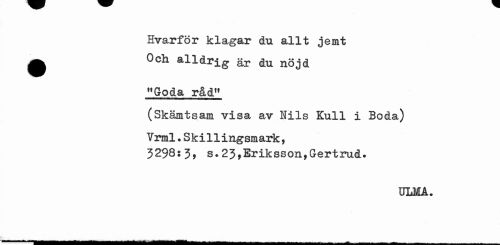 //// Hvarför klagar du allt jemt //// ^ Och alldrig är du nöjd //// "Goda råd" //// (Skämtsam visa av Nils Kull i Boda) //// Vrml.Skillingsmark, //// 3298:J, s.23,Eriksson,Gertrud. //// ULMA. ////