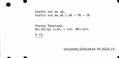 //// Yarför ror du så, //// Varför ror du så i må - få - få //// Västra Värmland, //// Nr.36(34) s.47, 1 str. Mel.not. //// D 23. //// HELLGR&N, SÅNGLEKAR FR.NÄÄS,II. ////