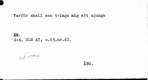//// Yarför skall man tvinga mig att sjunga j //// EE. //// 4:4, SLS 47, s.63,nr.62. //// i BO. //// ^ . ___-...- - ...---V - ---^^^ ////