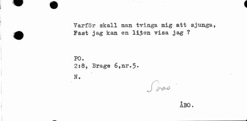 //// Varför skall man tvinga mig att sjunga, A, Fast jag kan en li;ten visa jag ? //// PO. //// 2:8, Brage 6,nr.5. N. //// J ir** //// ÅBO. ////