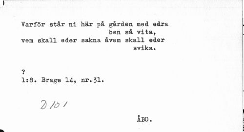 //// / //// Varför står ni här på gården med edra //// ben så Tita, vem skall eder sakna åTem skall eder //// STika. //// ? //// 1:8. Brage 14» nr.21. //// l i //// ÅBO. t ////