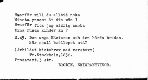 //// Hvarför will du alltid neka Minsta ynnest åt din wän ? Hwarför fick jag aldrig smeka Dina runda kinder än ? //// S,45* Den unga Mästaren och den hårda bruden. //// Här skall bröllopet stå? //// (Avbildat kistebrev med verstext) //// Tr.Stockholm,1852. Prosatext,3 str. //// BRODII, EMIGRANTYIS OR. ////