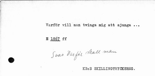 //// Varför vill man tvinga mig att sjunga ... //// E 1867 ff //// ^ Ioa^L ^^ //// KB:S SKILLINGTRYCKSREG. ////