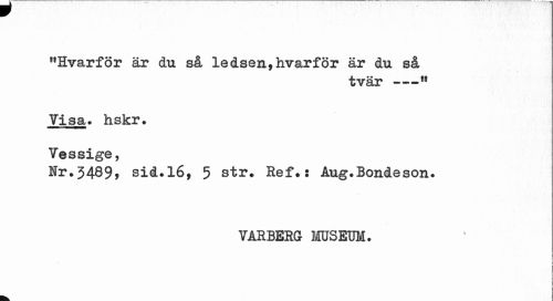 //// "Hvarför är du så ledsen,hvarför är du så //// tvär---11 //// Visa, hskr. Yessige, //// Nr.3489» sid. 16, 5 str. Ref.: Aug.Bondeson. //// VARBERG MUSEUM. //// i I //// : //// ! //// f ////
