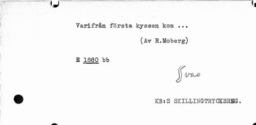 //// Ni //// Varifrån första kyssen kom ... //// (Av R.Moberg) //// E 1880 bb //// 9 KB:S SKILLINGTRYCKSREG. ////