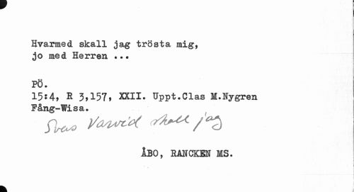 //// Hvarmed skall jag trösta mig, jo med Herren ... //// FÖ. //// 15:4, R 3,1571 XXII. Uppt.Clas M.Nygren Fång-Wi sa. //// ÅBO, HMCKEN MS. //// I //// k i ////