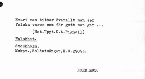 //// Hvart nian tittar överallt man ser falska varor som för gott man ger .•. //// (Hot .Uppt.K.A.Eignell) //// Falskhet* //// Stockholm, //// Mskpt.,Soldatsånger,E.U.29053. //// MORD.MUS. //// 1 ////