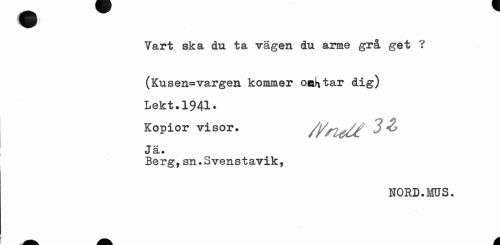 //// Yart ska du ta vägen du arme grå get ? (Kusen=vargen kommer omK tar dig) //// Lekt.1941* //// Kopior visor. ///Z^Ct ^ & //// Jä« //// Berg,sn.Svenstavik, //// NORD.MUS. //// A. A ////