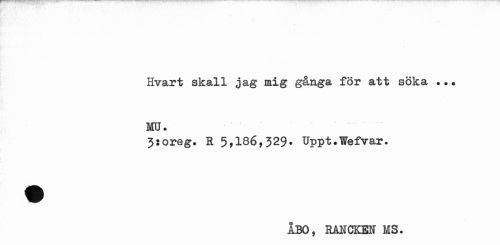 //// Hvart skall jag mig gånga för att söka ... MU. //// 3$oreg. R 5,186,329. Uppt.Wefvar. //// ÅBO, RANCKM MS. ////