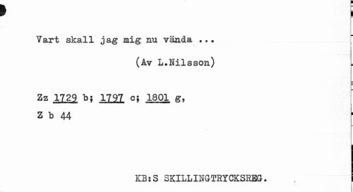 //// t i //// Vart skall jag mig nu vända ... //// (Av L.Milsson) //// Zz 1729 b5 1797 cj 1801 g, //// Z b 44 //// KB:S SKILLINGTRYCKSEEGr. | ////