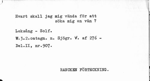 //// Hvart skall jag mig vända för att //// söka mig en vän ? //// Leksång - Solf. //// W.3.2.omtagn. n. Sjögr. V. af 276 -Del.II, nr.907. //// HM OKEN FÖRTECKNING. 1 //// i ¦ //// g ////