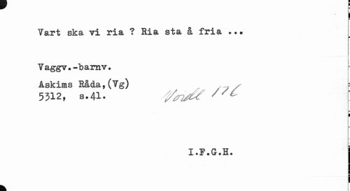//// f y 1 //// Vart ska vi ria ? Ria sta å fria . //// ¦ //// Vaggv.-barnv. Askims Råda,(Vg) //// 5312, s.41. //// I.F.G.H. | //// t ////