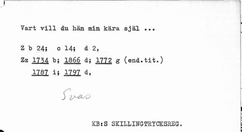 //// ¦ //// Vart vill du hän min kära själ ... //// Z b 24; c 145 d 2, Zz 1754 b; 1866 d; 1772 g (end.tit.) 1281 H 1121 d, //// i ¦ //// KBsS SKILLINGTBYCKSREG. i //// 1 //// k I ////