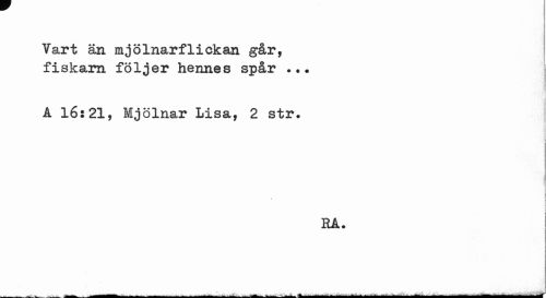 //// Yart än mjölnarflickan går, fiskarn följer hennes spår ... //// A 16:21, Mjölnar Lisa, 2 str. //// i //// i $ //// i //// RA. //// ___—^ .. ___. " . ___. ... A___^___._..._._._¦ - - --- - ////